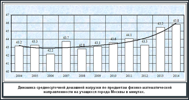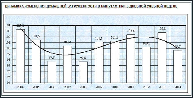 Динамика изменения суммарной среднесуточной домашней загруженности учащихся 5-11 классов московских школ. График демонстрирует среднее время подготовки учащиеся к занятиям при шестидневной учебной неделе и стандартном распределении количества часов (без сдвоенных уроков).