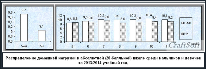 Распределение значений домашней нагрузки в 5-11 классах среди мальчиков и девочек московских школ в 2013/ 2014 учебном году. Значения представлены в абсолютной 20-балльной шкале.
