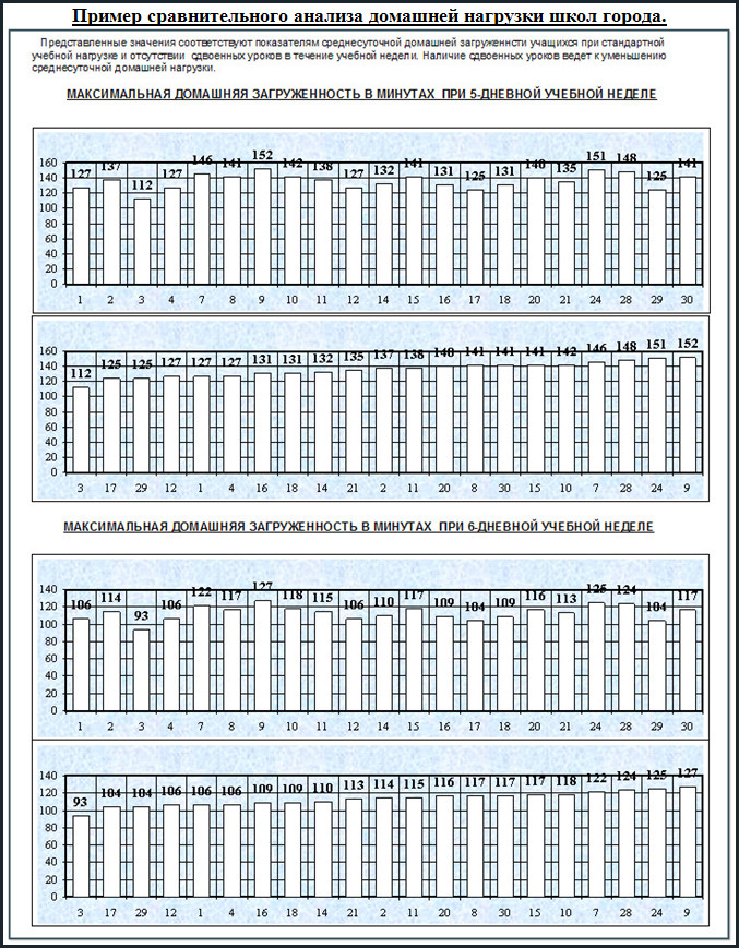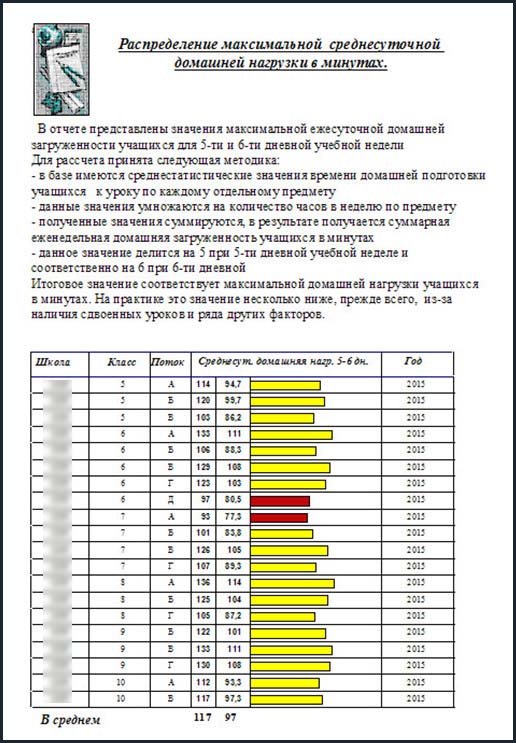 Среднее время подготовки определялось по следующим предметам: алгебра, физика, химия, история, биология, иностранный язык, литература, русский язык, география, информатика. Отчеты составлены для 6-ти дневной учебной недели (некоторые для 5-ти дневной учебной недели) при стандартном распределении почасовой учебной нагрузки.