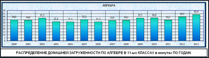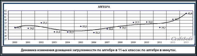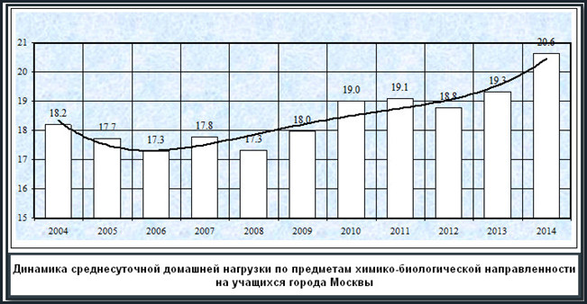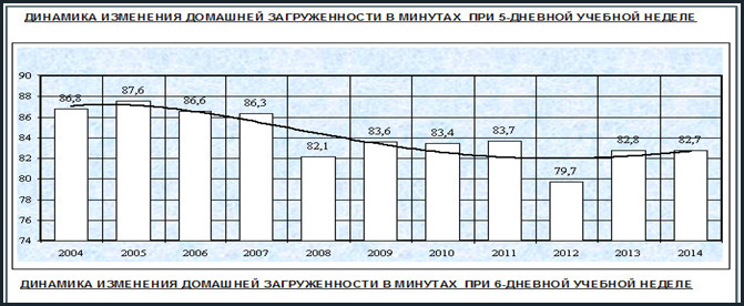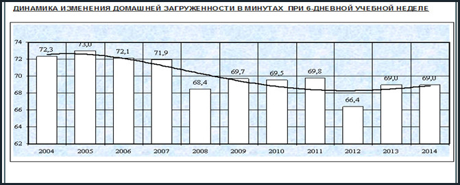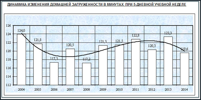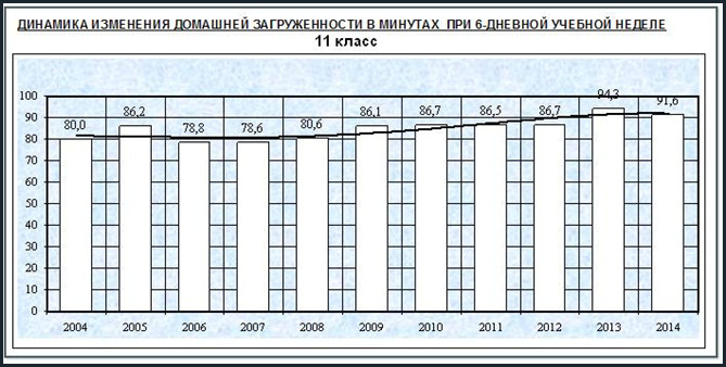 Динамика изменения суммарной среднесуточной домашней загруженности учащихся 5-11 классов московских школ. График демонстрирует среднее время подготовки учащиеся к занятиям при шестидневной учебной неделе и стандартном распределении количества часов (без сдвоенных уроков).