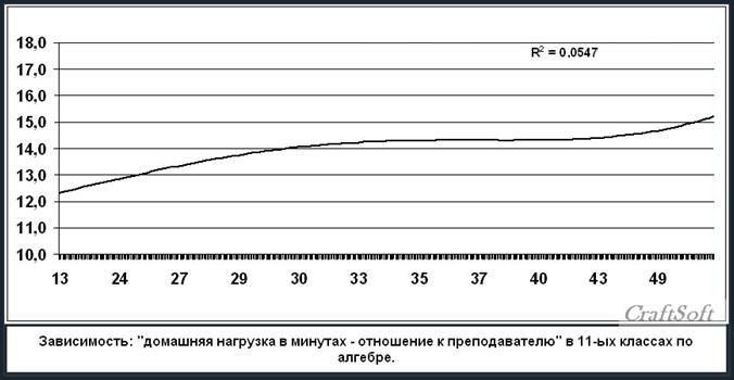 Зависимость между величиной домашней нагрузки по алгебре и отношением к преподавателю на примере 11-ых классов г. Москвы. Значения представлены в абсолютной (20-балльной шкале).