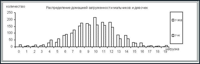 Распределение значений домашней нагрузки в 5-11 классах среди мальчиков и девочек московских школ в 2013/ 2014 учебном году. Значения представлены в абсолютной 20-балльной шкале.